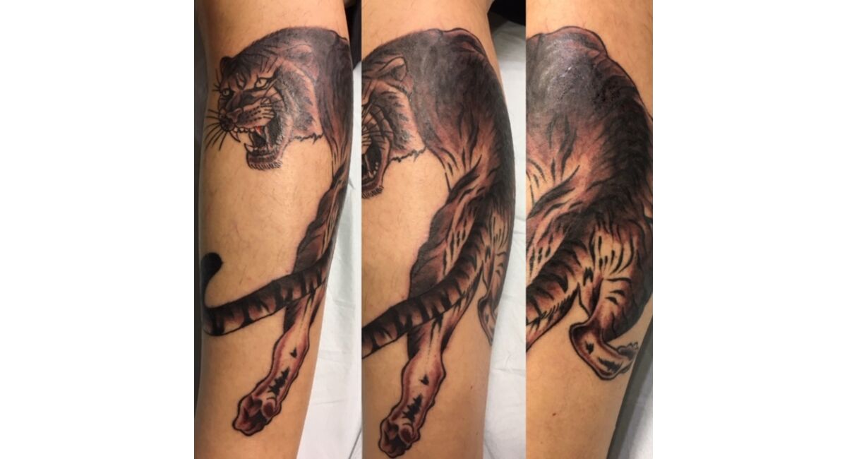 コチラの虎のデザインはお客様も持ち込みデザインです。当店では今まで、どちらかと言うとタトゥーデザインが多かったのですが、これからは和彫り・日本伝統刺青にも力を入れていこうと思っています。僕も歳をとってきたので、そろそろ切り替えの時期かなと思っています。勿論、タトゥーデザインも引き続きお受けいたします。