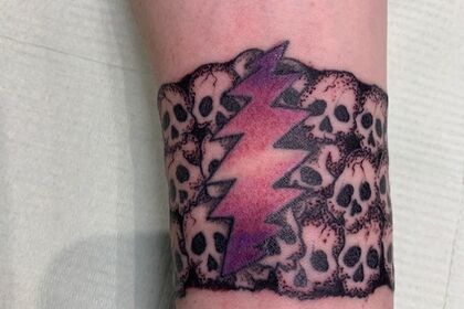 骸骨 骸骨と稲妻のタトゥーです。小さな骸骨が腕を一周埋め尽くすデザインです。つなぎの部分には稲妻のデザイン。ロックっぽいですね!! ナイスタトゥーでは、スタッフ募集中です。タトゥーに興味がある...